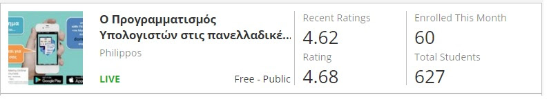 Μέχρι στιγμή στο μάθημα έχουν γραφτεί και το παρακολουθούν 627 μαθητές και εκπαιδευτικοί (Εικόνα 3) και η γενικότερη αίσθηση που έχουν αποκομίσει (με βάση την αξιολόγηση τους) είναι ιδιαίτερα θετική (4.62 στα 5).