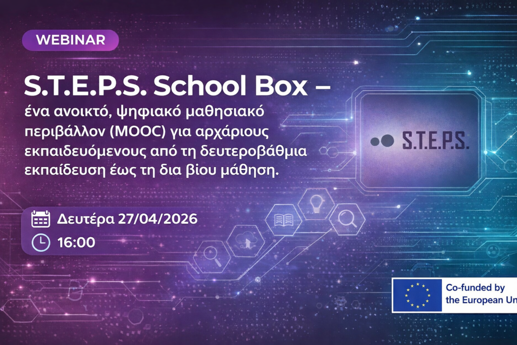 Τη Δευτέρα 27 Απριλίου 2026, στις 16:00-18:00, θα γίνει παρουσίαση του S.T.E.P.S. School Box (https://moocsteps.eu/) — μιας συλλογής ανοικτών μαθημάτων και εκπαιδευτικών δραστηριοτήτων για τη πρωτοβάθμια και δευτεροβάθμια εκπαίδευση, οργανωμένη σε τέσσερις θεματικές: Προγραμματισμός, Τεχνολογία, Αειφορία και Μηχανική.